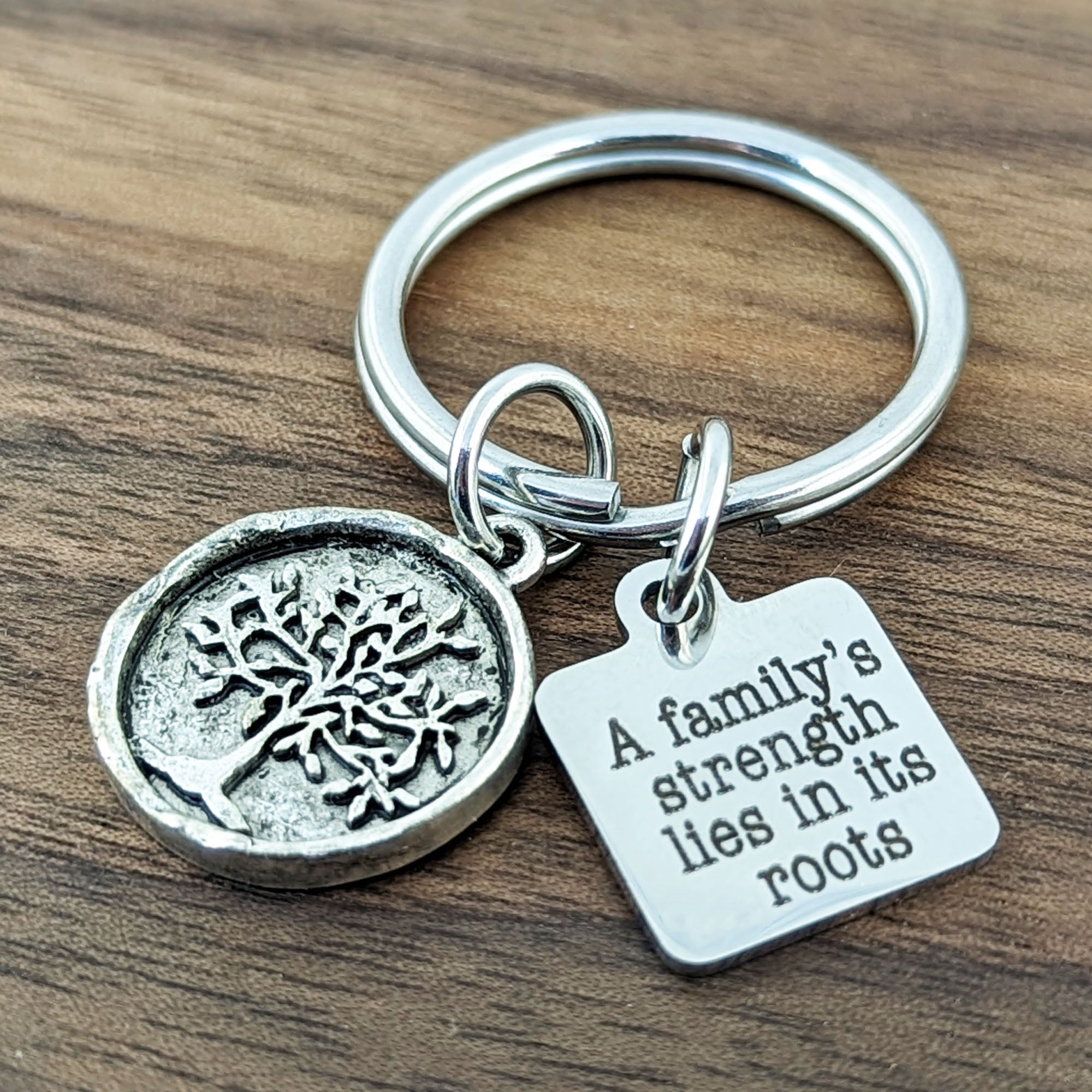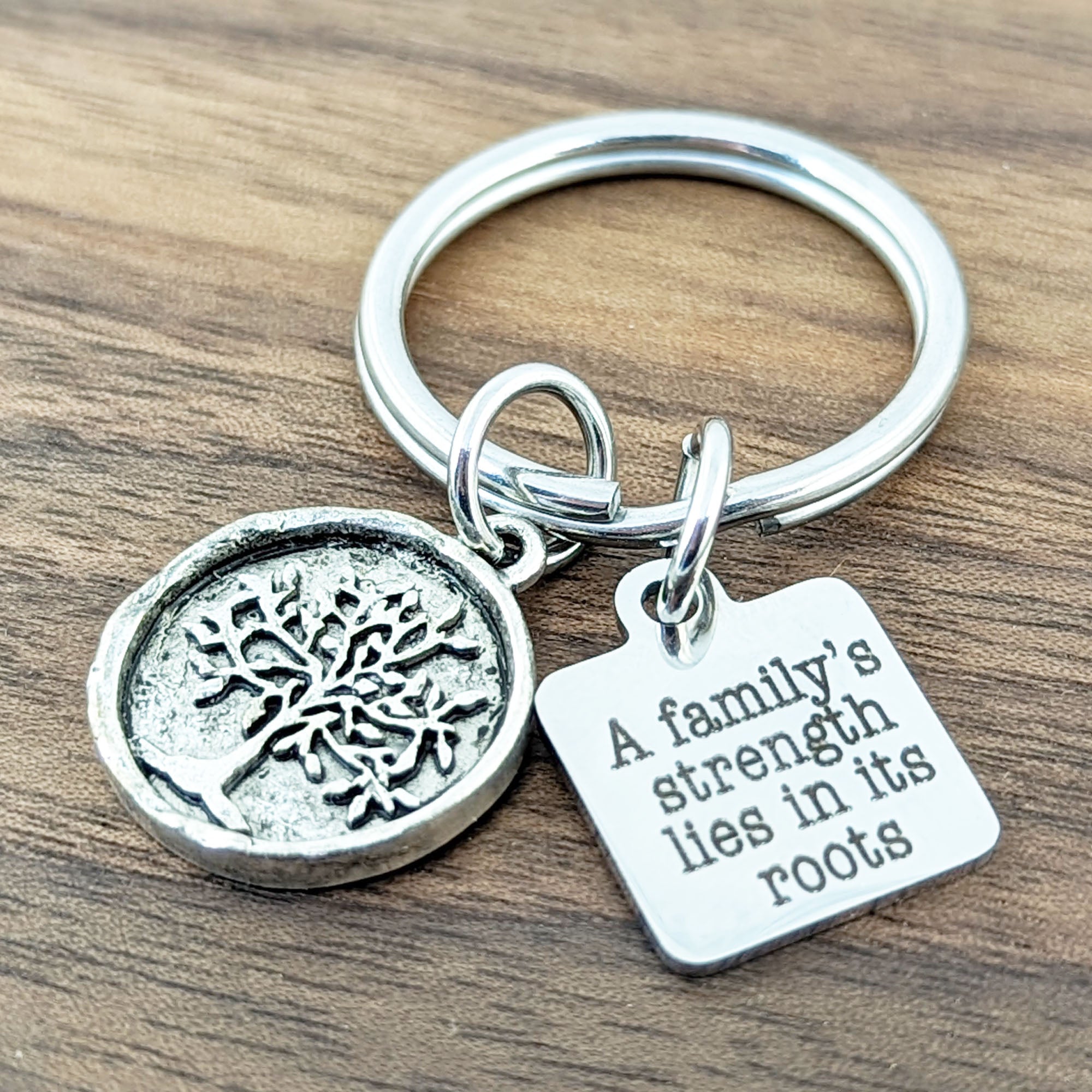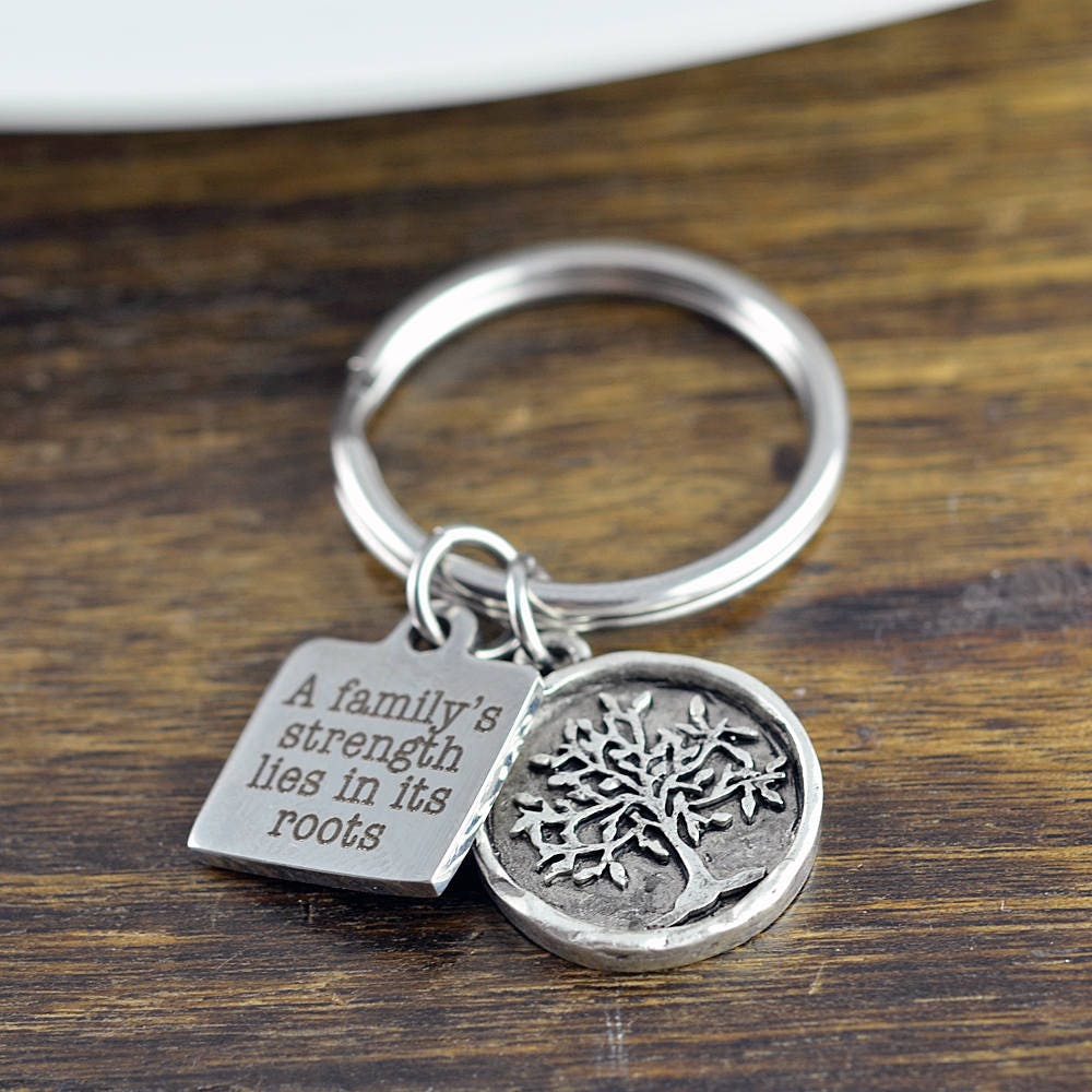 Features an engraved disc with " A Family's Strength lies in its Roots" and a detailed family tree on a stainless steel key ring.