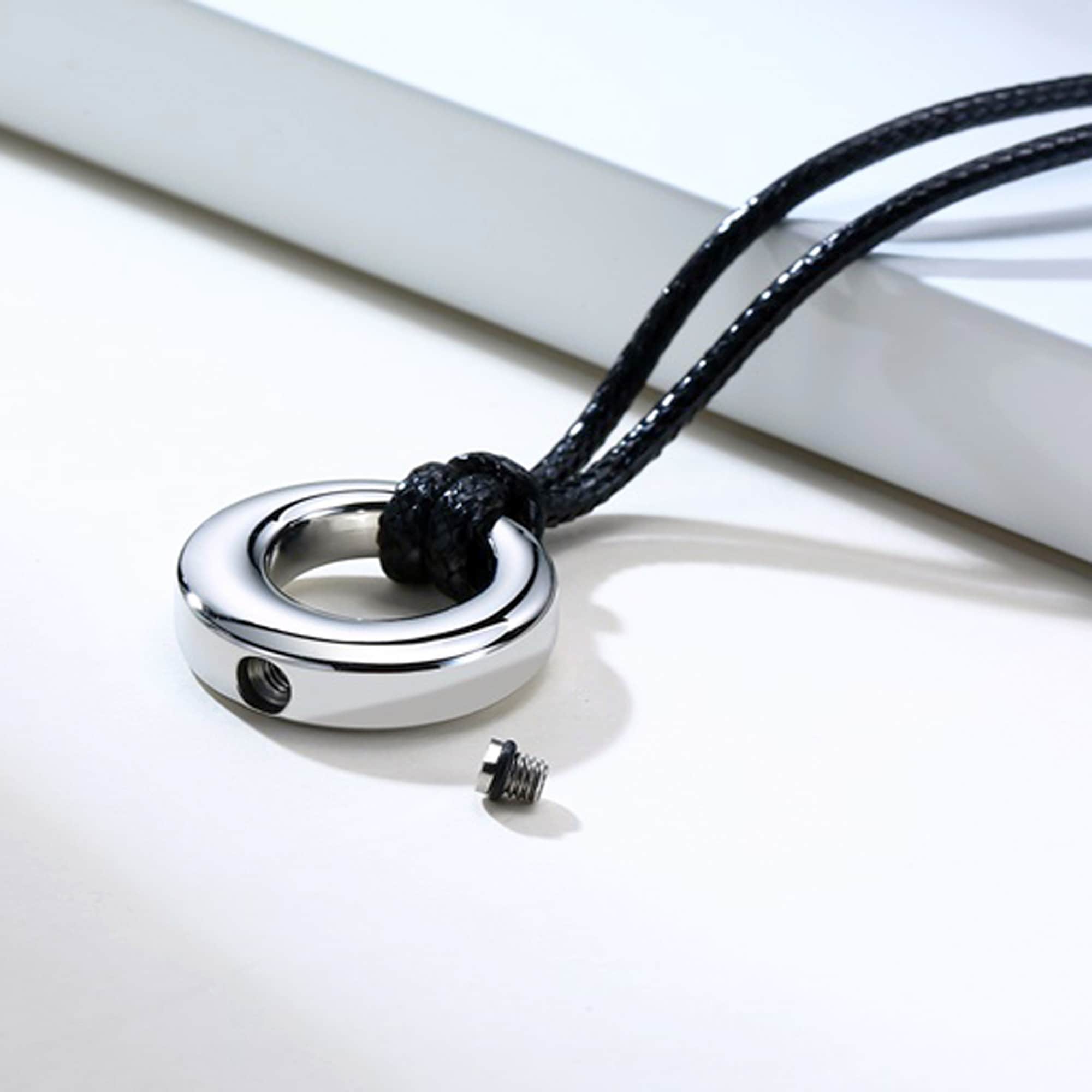 This pendant is a sleek and elegant circle in stainless steel. The circle is a classic symbol of eternity or infinity. This symbolism may bring comfort to those who wear it in remembrance of a loved one's life. This pendant contains a small compartment to hold a pinch of cremated remains.